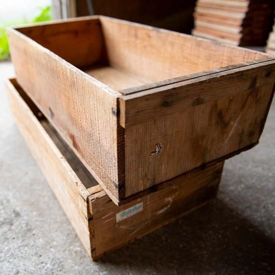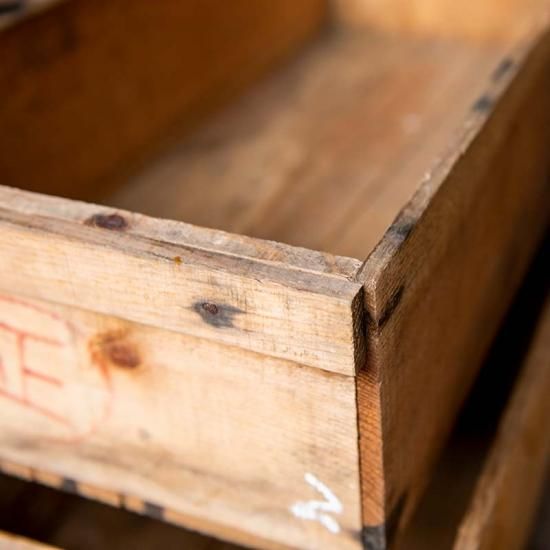 実際に果物の出荷に使用されてリサイクルされている木箱です。汚れや書き込みなど、幾度もの流通を経て年季の入った特有の「味わい」をお楽しみください。
